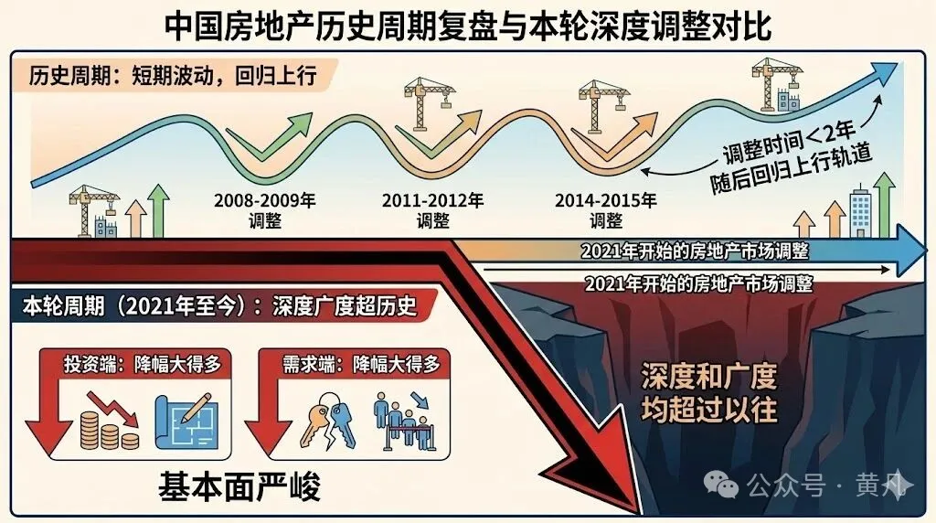 然而本轮自2021年开始的房地产市场调整,在深度和广度上均超过了以往的周期性波动。当前这轮周期与历史不同,其下行阶段的基本面情况更为严峻。从投资和需求两端来看,本轮周期的降幅都比以往几次大得多。