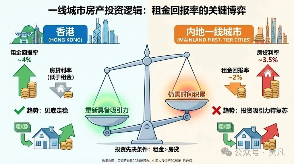 在中国的一线城市中,目前只有香港的房价已呈现见底走稳的趋势,其背后的强支撑是接近4%的租金回报率。而内地一线城市的租金回报率总体徘徊在2%左右(数据来源:贝壳研究院2024年报告),明显低于目前国内首套房贷平均利率约3.5%的水平(数据来源:中国人民银行2025年1月数据)。租金回报率高于房贷利率,使租金收入能覆盖房贷还款,是房地产投资重新具备吸引力的先决条件。仅从这一点看,这一条件的实现并非一朝一夕之功。