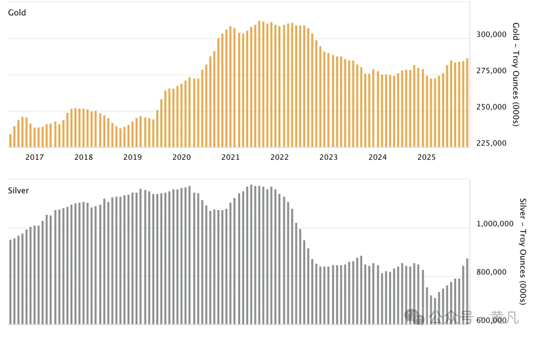 伦敦银库库存从2022年的31,023吨跌至2025年的22,126吨,甚至一度“几乎无货”(据silvercoins.com的报道)